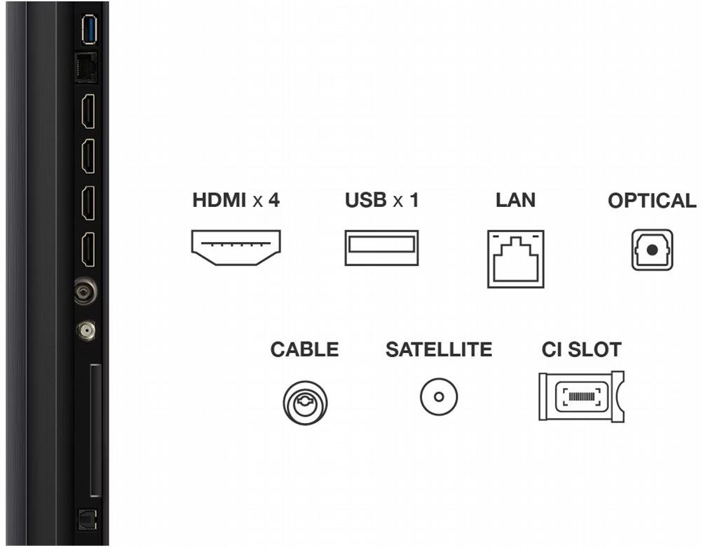 De televisie is uitgerust met vier HDMI 2.1 poorten, een USB aansluiting, CI+ ondersteuning en een optische audio uitgang, waardoor je eenvoudig randapparatuur zoals consoles, mediaspelers en soundbars kunt aansluiten. Het ontwerp is slank en modern met een vrijwel randloos scherm, waardoor de focus volledig op het beeld ligt en de televisie naadloos in elk interieur past. Met ondersteuning voor VESA montage is wandmontage eenvoudig te realiseren.