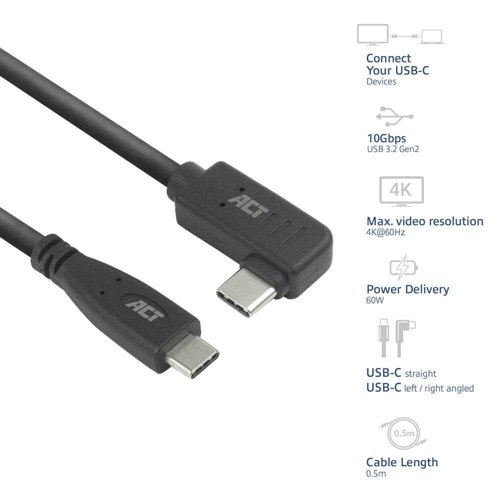 AC7405 | USB 3.0 Kabel | USB-C (recht) naar USB-C (haaks) | 60W | 10Gbps | 0,5m | Zwart