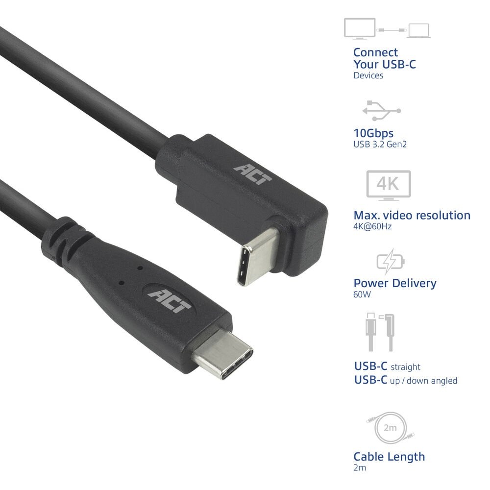 AC7472 | USB 3.2 Gen 2 Kabel | USB-C (recht) naar USB-C (haaks boven/beneden) | 60W | 10Gbps | 2m | Zwart