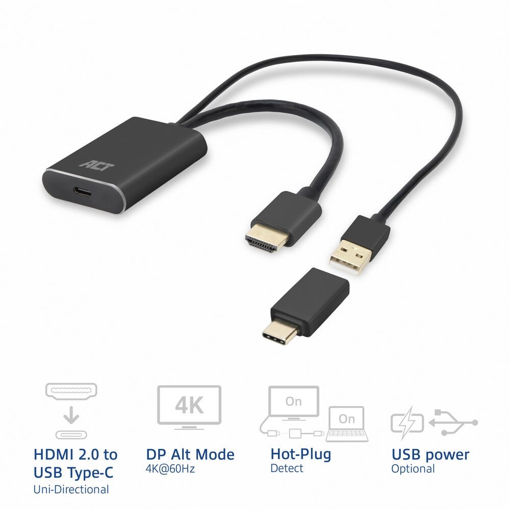 De ACT AC7537 HDMI naar USB Type-C®-adapter is een actieve uni-directionele converter om een laptop met HDMI te verbinden met een USB Type-C®-monitor. De AC7537 adapter ondersteunt een resolutie tot 3840x2160 (4K) @60Hz en heeft een USB-A/USB Type-C®-kabel voor extra stroom wanneer dit nodig is. Dankzij de hot-plug detectie is deze adapter plug-and-play te gebruiken.