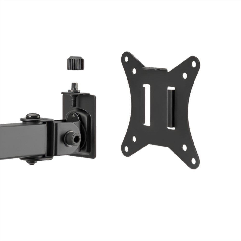 De beugel is vervaardigd uit duurzaam staal en kunststof met een zwarte poedercoating, wat zorgt voor een moderne uitstraling die past in elke werkomgeving. De armen zijn volledig verstelbaar, met een kantelbereik van +45° tot -45°, een draaibereik van +90° tot -90°, en een rotatiecapaciteit van +180° tot -180°, waardoor je de schermen eenvoudig kunt aanpassen aan je ideale kijkhoek. De hoogte van de centrale paal is 407 mm, en de armen hebben een bereik van 376 mm, wat flexibiliteit biedt in de positionering van je monitoren.