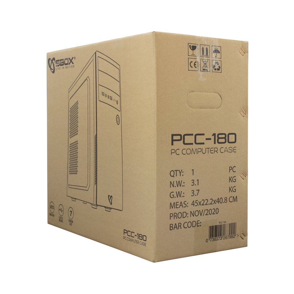 SBOX PCC-180. Vormfactor: Midi Tower, Soort: PC, Kleur van het product: Zwart. Voorste ventilators ondersteunende diameters: 120 mm, Zijkant ventilators ondersteunende diameters: 120 mm, Achterkant ventilators ondersteunende diameters: 80,90 mm. Ondersteunde HDD-groottes: 2.5,3.5,5.25". Breedte: 358 mm, Diepte: 191 mm, Hoogte: 417,5 mm