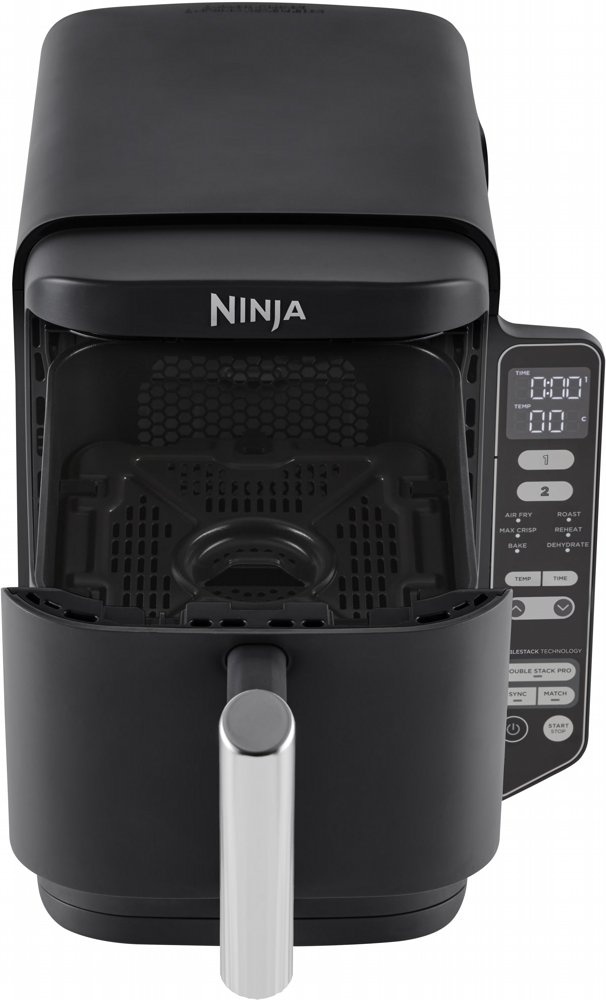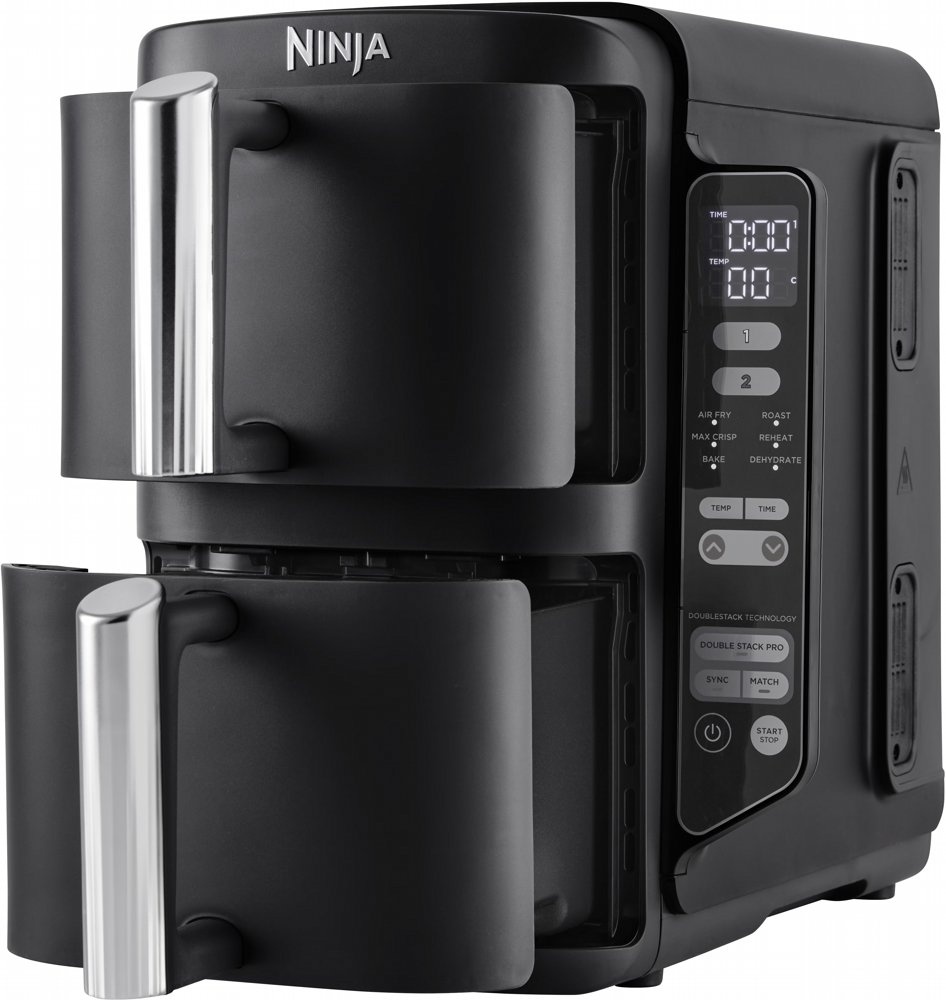 De Ninja SL300EU Double Stack Airfryer in elegant zwart is de ideale keukenhulp voor iedereen die gezond en snel wil koken zonder in te leveren op smaak of gemak. Met een royale inhoud van 7,6 liter verdeeld over twee gestapelde manden van elk 3,8 liter bereid je moeiteloos een maaltijd voor het hele gezin. Je kunt er een complete kip van 1,2 kilo in garen of 400 gram friet per mand knapperig bakken, ideaal voor zowel dagelijkse maaltijden als etentjes met vrienden.