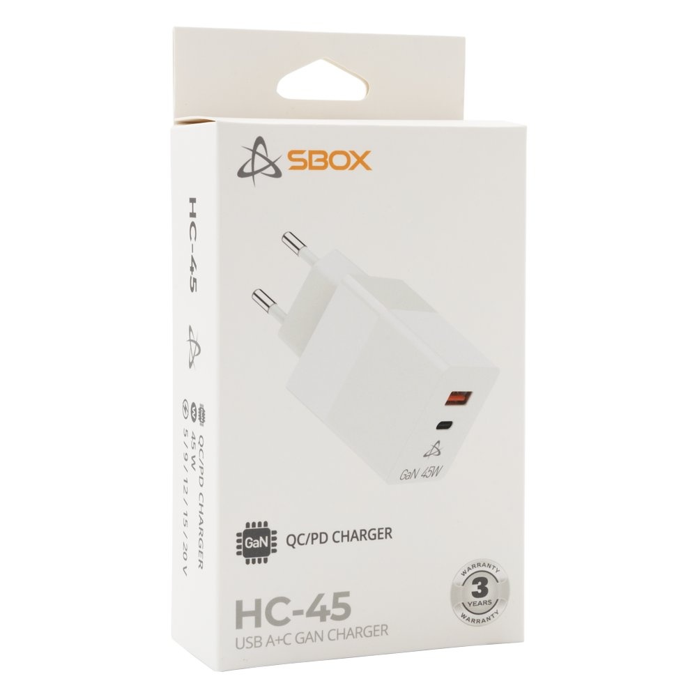 De SBOX HC-45 is een krachtige en compacte USB-oplader met een totaal vermogen van 45 watt, uitgerust met zowel een USB-A- als een USB-C-poort. Dankzij de geavanceerde GaN-technologie levert deze oplader efficiënte prestaties in een slank ontwerp, ideaal voor thuisgebruik, op kantoor of onderweg. Met ondersteuning voor zowel Power Delivery (PD) als Quick Charge (QC) protocollen zorgt de HC-45 voor snel en veilig opladen van een breed scala aan apparaten, waaronder smartphones, tablets en laptops.