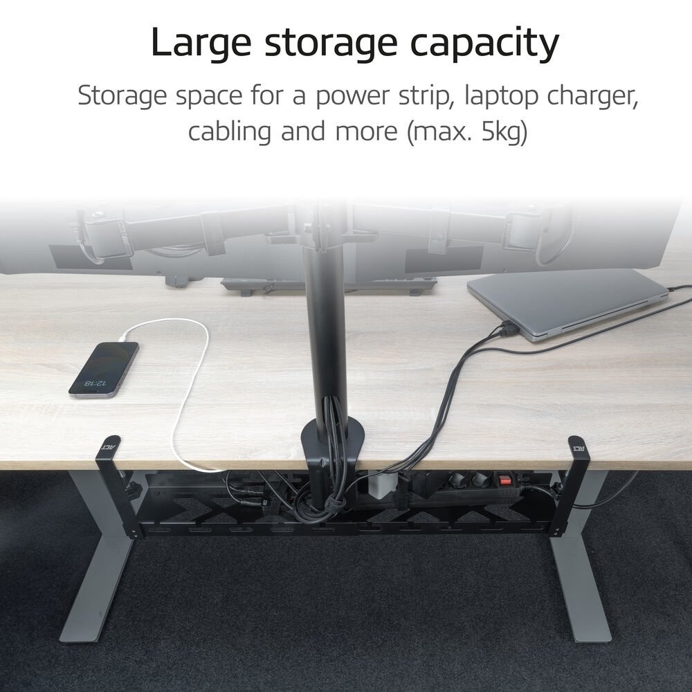 De metalen AC8379 kabelgoot zorgt voor het netjes en opgeruimd houden van een bureau en voor het ordenen van kabels. De kabelgoot is eenvoudig verstelbaar en aan te passen aan de gewenste breedte: 43 - 72 cm. Hierdoor is de AC8379 geschikt voor verschillende maten bureaus en biedt genoeg ruimte voor het opbergen van een stekkerdoos, laptoplader, kabels en meer. De kabelgoot heeft een open structuur voor betere ventilatie en kabelgeleidingen en is te monteren zonder te schroeven of het boren van gaten. Bevestig de goot onder een bureau (maximale tafeldikte 50mm) met het bijgeleverde klemsysteem. De AC8379 kan samen worden gebruikt met een monitorarm met klemmontage.